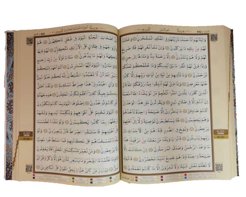 Diyanet Mühürlü Diyanet İşleri Başkanlığı Mushafları İnceleme ve Kıraat Kurulu'ndan Onaylı ve Mühürlü Hat Milyonlarca insanın Kur'ân-ı Kerim okumasını öğrendiği hattan.Okuması çok kolay bilgisayar hatlı QR Kod Teknolojisi Var Kapak Renk Lacivert İç Baskı Özelliği 4 Renk Boy Orta Boy (17 cm * 24 cm) Kapak Termo İç Kağıt 1. Hamur